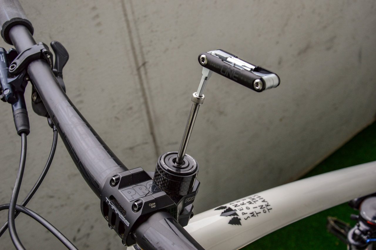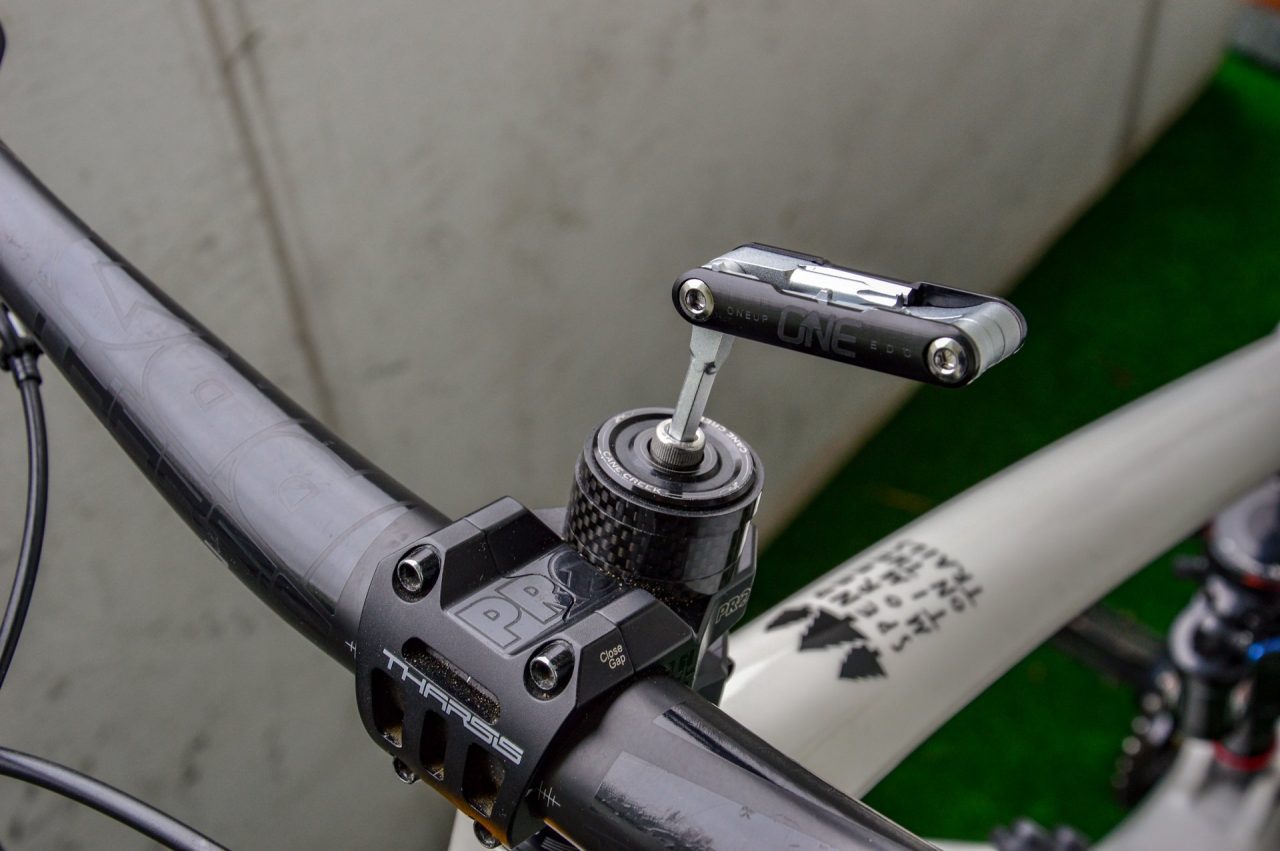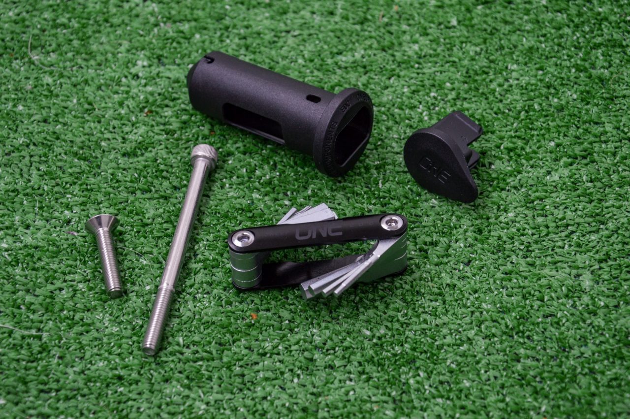 Włożenie takiego dużego zestawu narzędzi do rury sterowej amortyzatora sprawia, że trzeba pozbyć się klasycznej „szyszki” i zamontować zestaw OneUp. W tym celu, za pomocą specjalnego narzędzia, trzeba nagwintować górną część rury sterowej widelca, co w praktyce równa się niestety z utratą gwarancji na amortyzator.