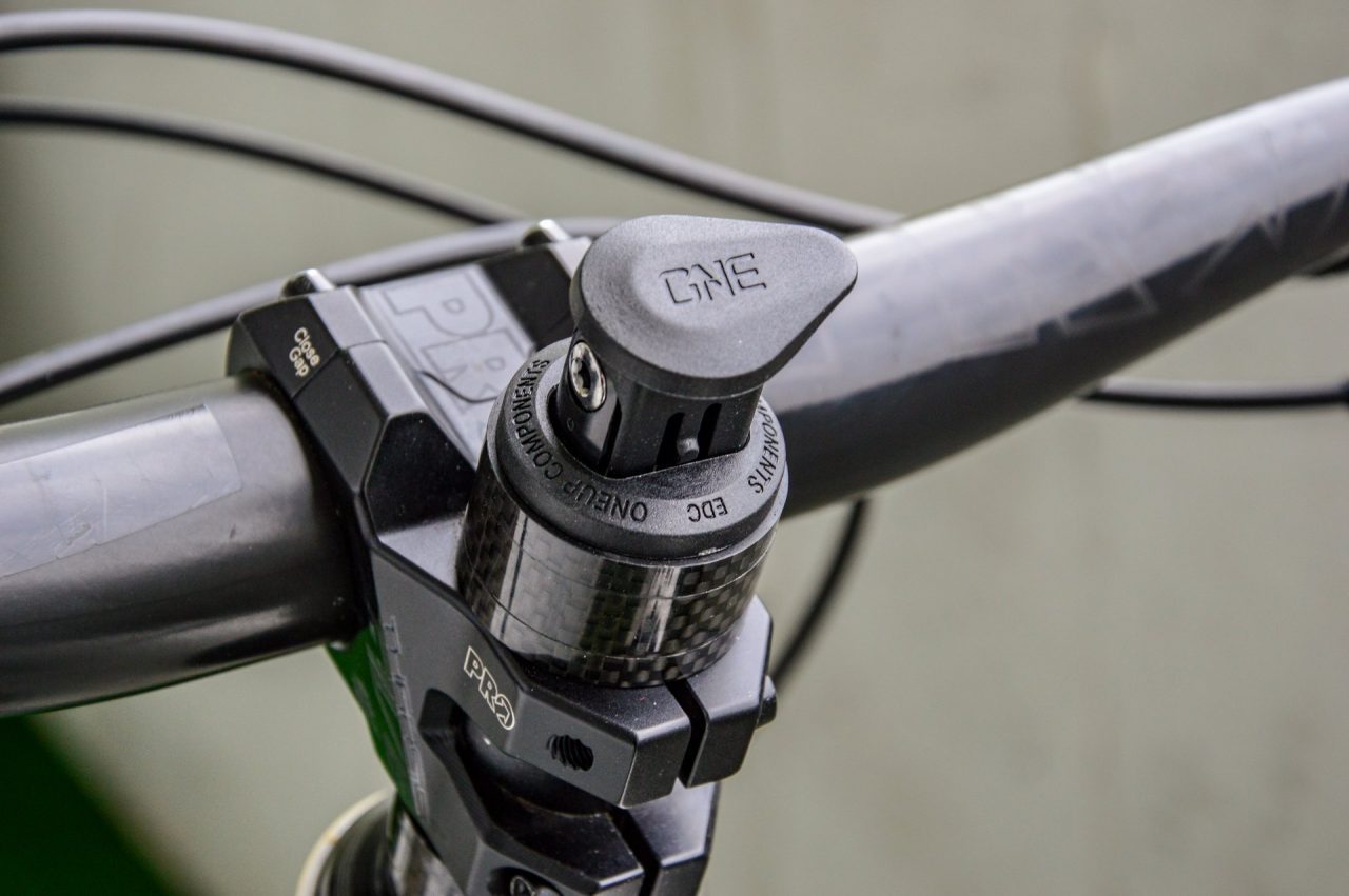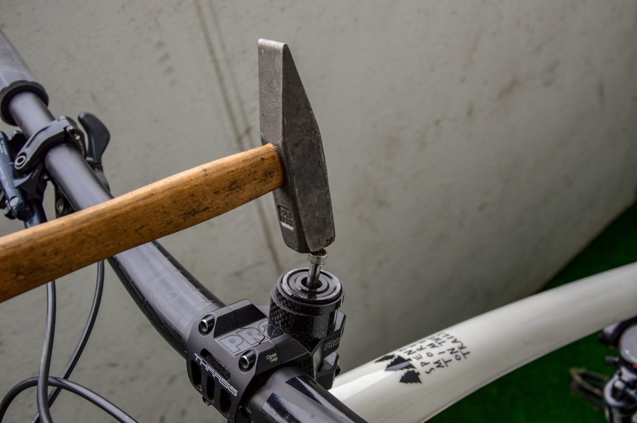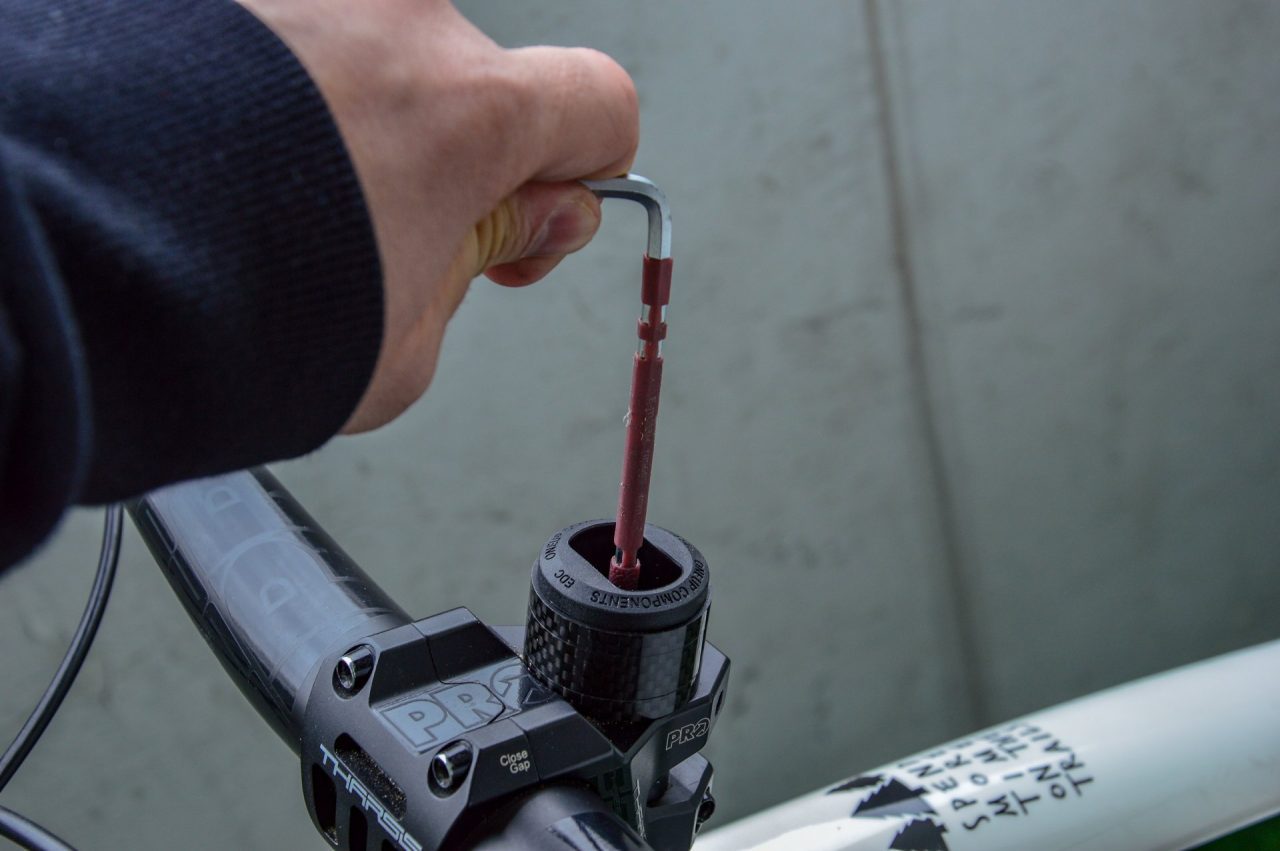 Włożenie takiego dużego zestawu narzędzi do rury sterowej amortyzatora sprawia, że trzeba pozbyć się klasycznej „szyszki” i zamontować zestaw OneUp. W tym celu, za pomocą specjalnego narzędzia, trzeba nagwintować górną część rury sterowej widelca, co w praktyce równa się niestety z utratą gwarancji na amortyzator.