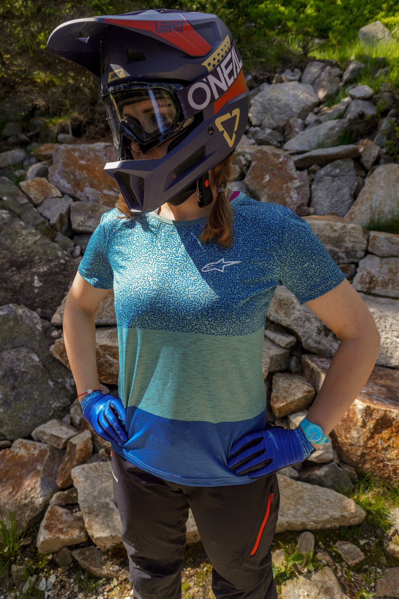 Koszulka MTB Alpinestars Stella Alps 8.0 SS ma krótki rękaw. Wybrałam wersję kolorystyczną Stillwater, czyli odcienie niebieskiego z fioletową wstawką przy szyi i ciekawą grafiką na piersiach. Krój jest lekko taliowany i długi, ale sprytnie przemyślany: krótszy z przodu i dłuższy na plecach.