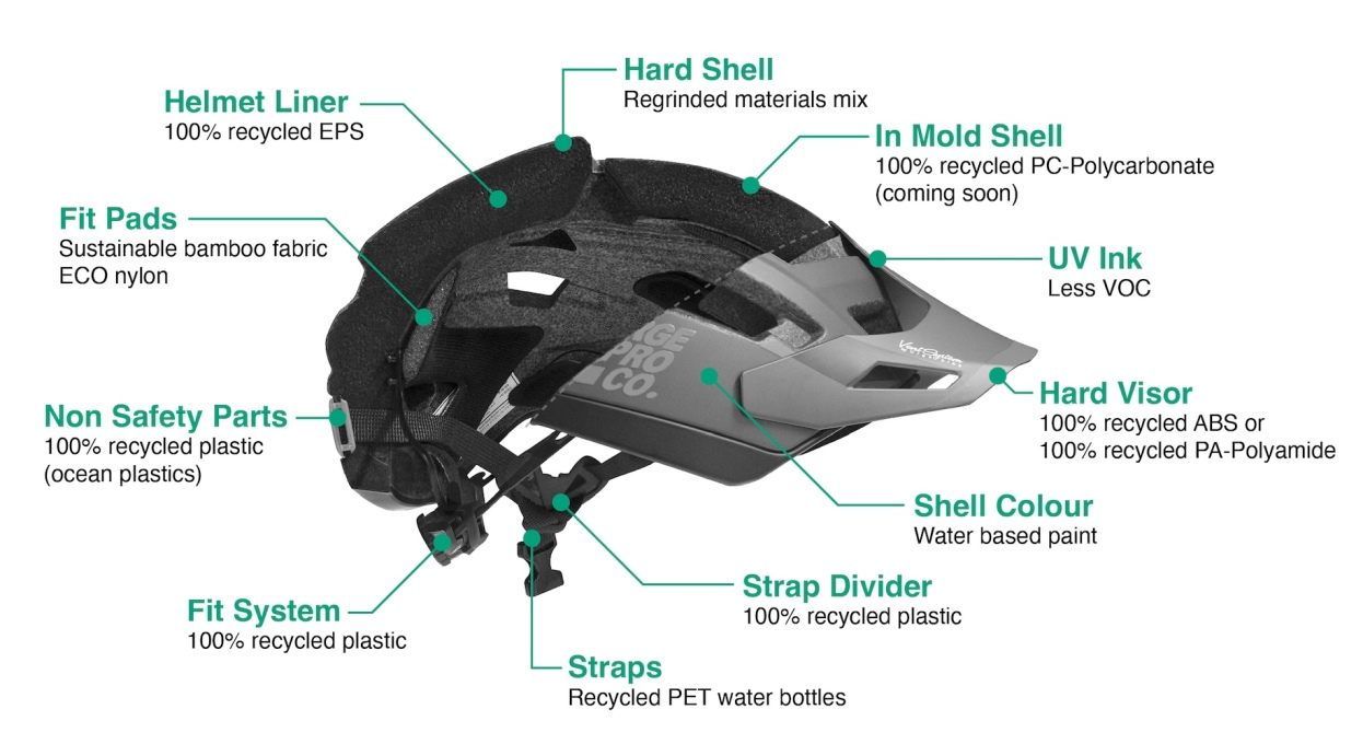 - EPS z recyklingu – Wysokiej jakości polistyren pochodzący z przemysłu samochodowego zapewnia doskonałą amortyzację, przy jednoczesnym ograniczeniu zużycia surowców pierwotnych i energii. Kaski pozostają trwałe i niezawodne.