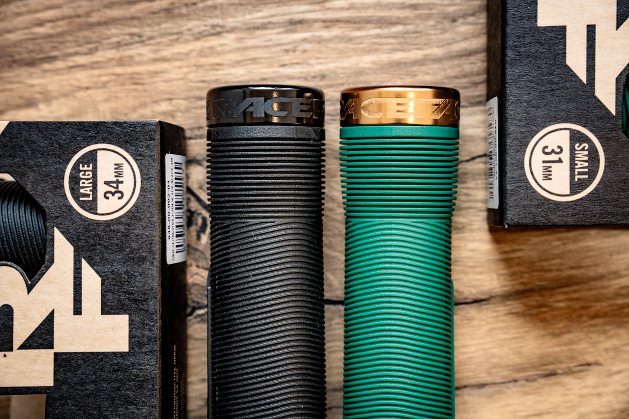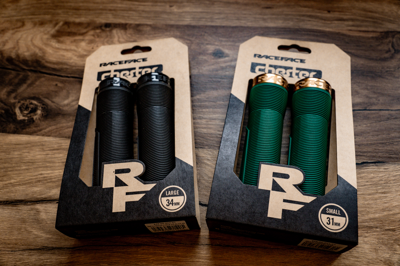 Podczas badań rozwojowych wzięte pod uwagę były wszystkie opinie ich zawodników i testerów. No i bardzo szybko wyszło, że ciężko tu zrobić tak aby jeden wzór i kształ był idealny dla wszystkich. Dlatego właśnie chwyty Race Face Chester dostępne są w 2 średnicach: 31 mm i 34 mm. Jedna kwestia to wielkość dłoni, druga to też osobiste preferencje i przyzwyczajenia. Średnica mocowania na kierownicy, oraz szerokość chwytów jest jedna i ta sama. Prążkowany materiał w przy wewnętrznej stronie chwytów w obydwu wersjach jest tak samo gruby, natomiast w miejscu gdzie palce oplatają chwyt widzimy już dosyć dokładnie różnicę w średnicy. Zewnętrzna końcówka chwytów jest miękka, ale też odporna na uderzenia. Grubsza wersja ma więcej miękkiego materiału i jest też nieco cięższa (135g para) niż 31 mm (112g para). Kolejną kwestią, w której możemy przebierać są kolory. Mowa tu zarówno o anodyzowanych kolorach obejm jak i gumy na chwytach.