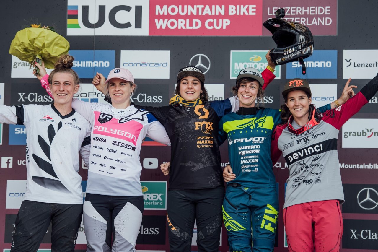 Staying true to the #FullgasMTB motto, Saturday’s Downhill mountain bike action easily exceeded expectations, even if the weather tried to throw a wrench in the plans with rain creeping over the idyllic Swiss town of Lenzerheide for most of the morning, resulting in some last-minute changes to race strategy for a number of the riders. With torrential rain on Wednesday, the first day of practice was a wet one, but on Thursday and Friday, the blazing sunshine brought about a dry track, until Saturday morning. Come race day, Lenzerheide’s ugly side reared its head – the morning rain changed track conditions quite quickly and with fog rolling through the mountains and settling on the Rothorn, visibility changed minute to minute. Nevertheless, the fifteen fastest women qualifiers took on an almost ever-changing track when the first start buzzer sounded at 12:30. The first benchmark was set by German racer Raphaela Richter, coming down the mountain in 3:44.136, a time that would put her in 8th place at the end of the day. Swiss speedster Camille Balanche turned on the afterburners, besting Richter’s time by 1.226 seconds, unofficially opening the Top 10, but Balanche’s stay in the hot seat was short lived, as Kate Weatherly, who qualified in eighth, managed to sneak by Balanche with a time that was 0.171 seconds faster. Weatherly and Balanche would hold on to their top spots until almost the very end of the race and only the top qualifiers were left at the top of the mountain.