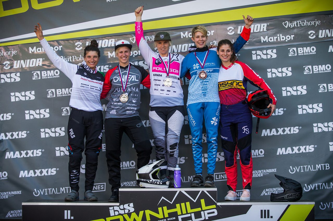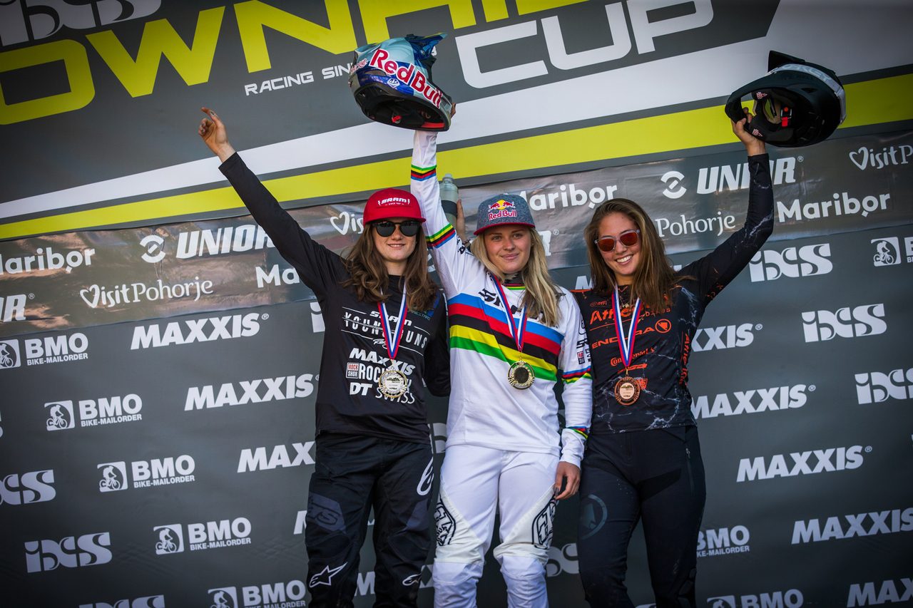 Next up was the Elite Women category, which only consisted of 30 riders this weekend, sadly missing some of its odds-on favorites. Last year’s winner Myriam Nicole (FRA – Commencal Vallnord) could not even make it to Maribor due to an injury, Tahnée Seagrave decided to sit this one out in preparation of the Worldcup and only attended the training and Emilie Siegenthaler (SUI – Pivot) crashed during a training session and reached the same decision. But, of course, there were lots of other high-ranking athletes left in this category! At the end of the day, Tracey Hannah succeeded again with a best time of 3.41,094 minutes and a 4-second gap towards Nina Hoffmann (GER – Juliana Bicycles) who finished in second place. Even though Hoffmann’s downhill career only started not that long ago, she already made quite the career and we are looking forward to what is next. Monika Hrastnik (SLO – Dorval AM Pro Racing Team), who is now supported by a professional team finished in third place and a successful season seems to lay ahead.
