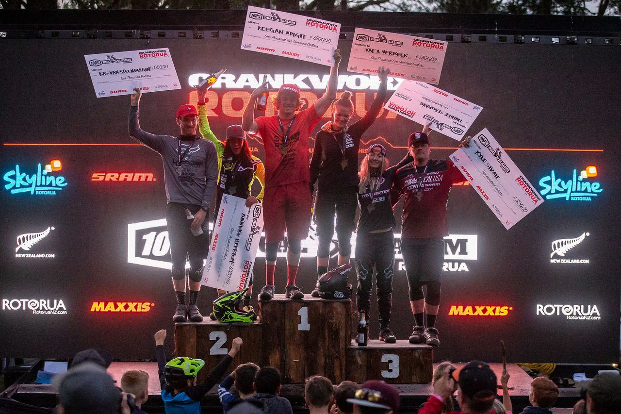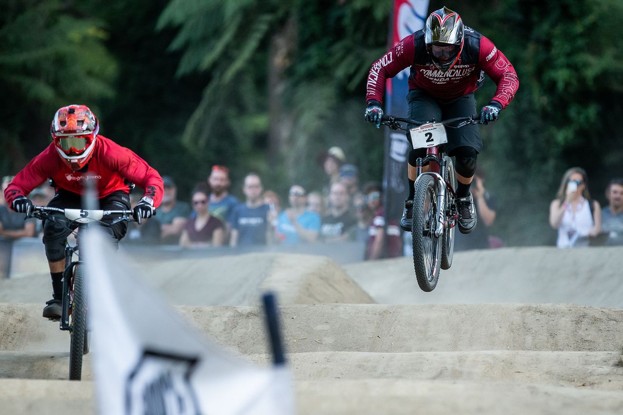 A deafening cheer ushered the first winner of Crankworx Rotorua 2019 across the dusty finish line tonight. Local rider Keegan Wright (NZL) blasted his way past legends and seasoned slalom masters, taking the win against Bas van Steenbergen (CAN) in the 100% Dual Slalom Rotorua.