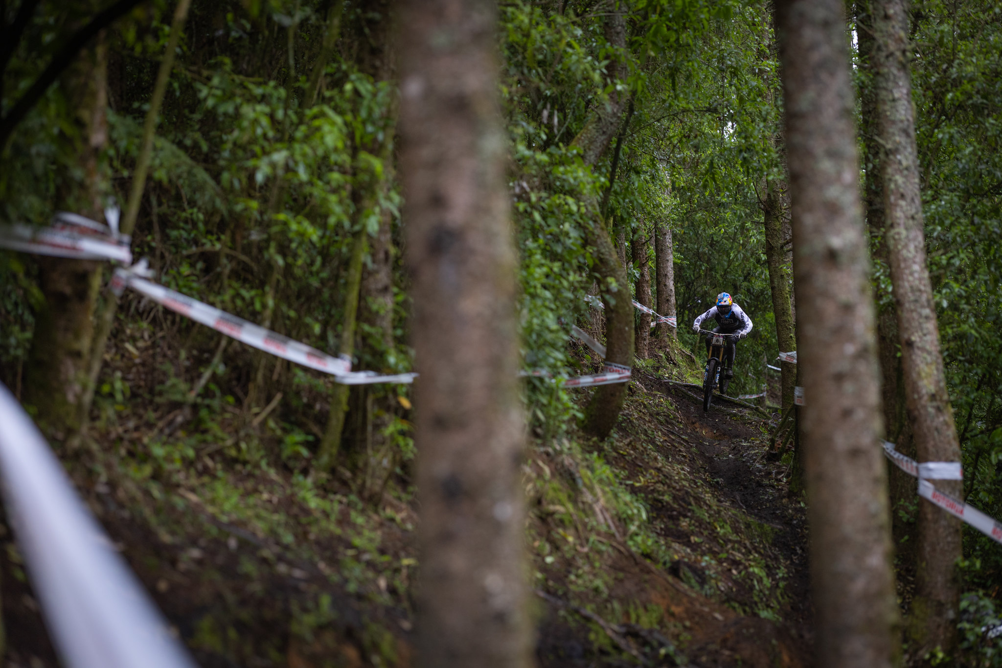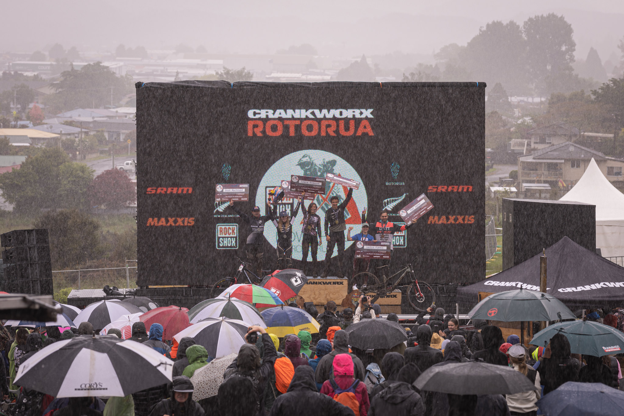 Day eight of Crankworx Rotorua brought a battle of the elements with the RockShox Rotorua Downhill event. With 75 mm of rain, and wind at the top, riders treated this more like a survival challenge than a typical race run with more tripods than the media crew. From seeding ’til the end of the elite male race runs, the rain came down hard, the ruts were deep, roots were exposed, mud bogs everywhere, and even a newly coined spectator feature called “Heckler’s Puddle.” It was a tough battle out there for riders to keep things rubber side down, and the fans were absolutely loving it.