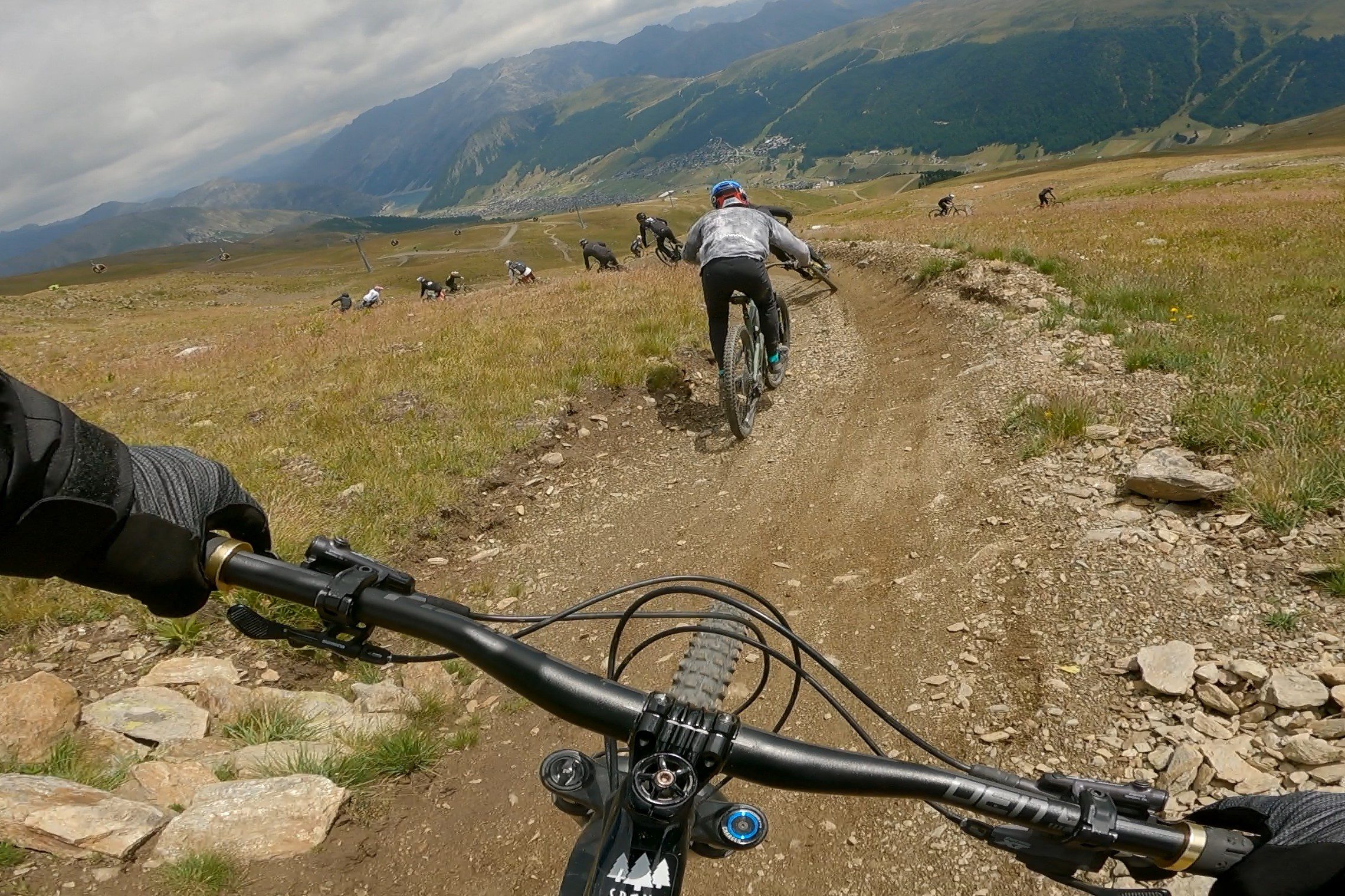 On the third day of the Great Days festival, You could choose to take the tour around Livigno area on E-Bikes led by Hans Rey. The second option, which we decided to go was a race in the form of Avalanche. This means the mass start downhill race. But before we started the main race the qualification runs awaited us. They were smaller races with randomly selected five competitors on the Blueberry trail. There is no timekeeping here, just riders start in one moment, and who will be first on the finish line wins. My personal bad runing start resulted in overtaking 3 riders on the winding trail. But still I was able to finish my qualifying run in first place. As it is aimed more to have fun than serious racing, everybody from first run was going to the main and final one. The result from qualifying run was only considered when placing the bikes for the mass start. The main Avalanche start has been set near top staion of gondola lift. Begining was more like freeride section, but it was wide enough for overtaking. Later the trail lead thru Bikers United and Blueberry Trails for a long and interesting run.