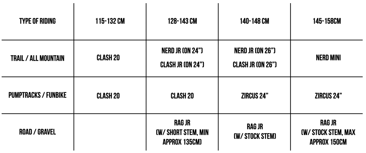 So, what rider height/age is the Nerd Mini for? Our two main test riders were Antek (13) who is around 152cm high and is somewhere in the middle of the sizing range of the Nerd Mini and Maks (9) who at 145cm is definitely at the bottom of the range but nevertheless his riding progressed very quickly after switching from the Nerd Jr. on 26″ wheels. So the range is quite wide.