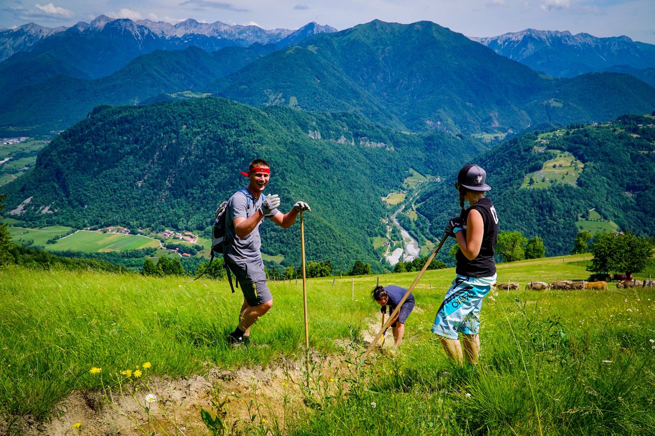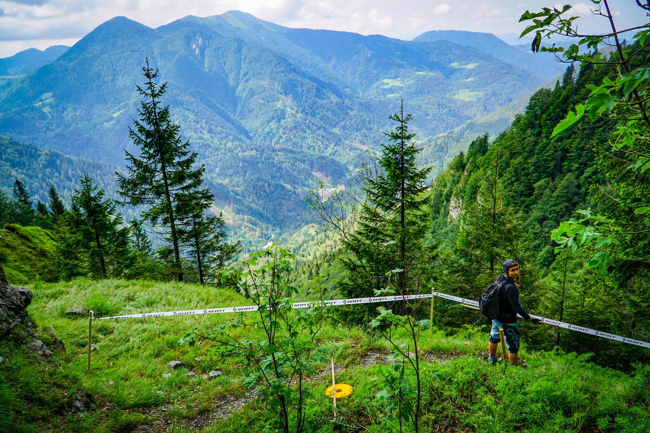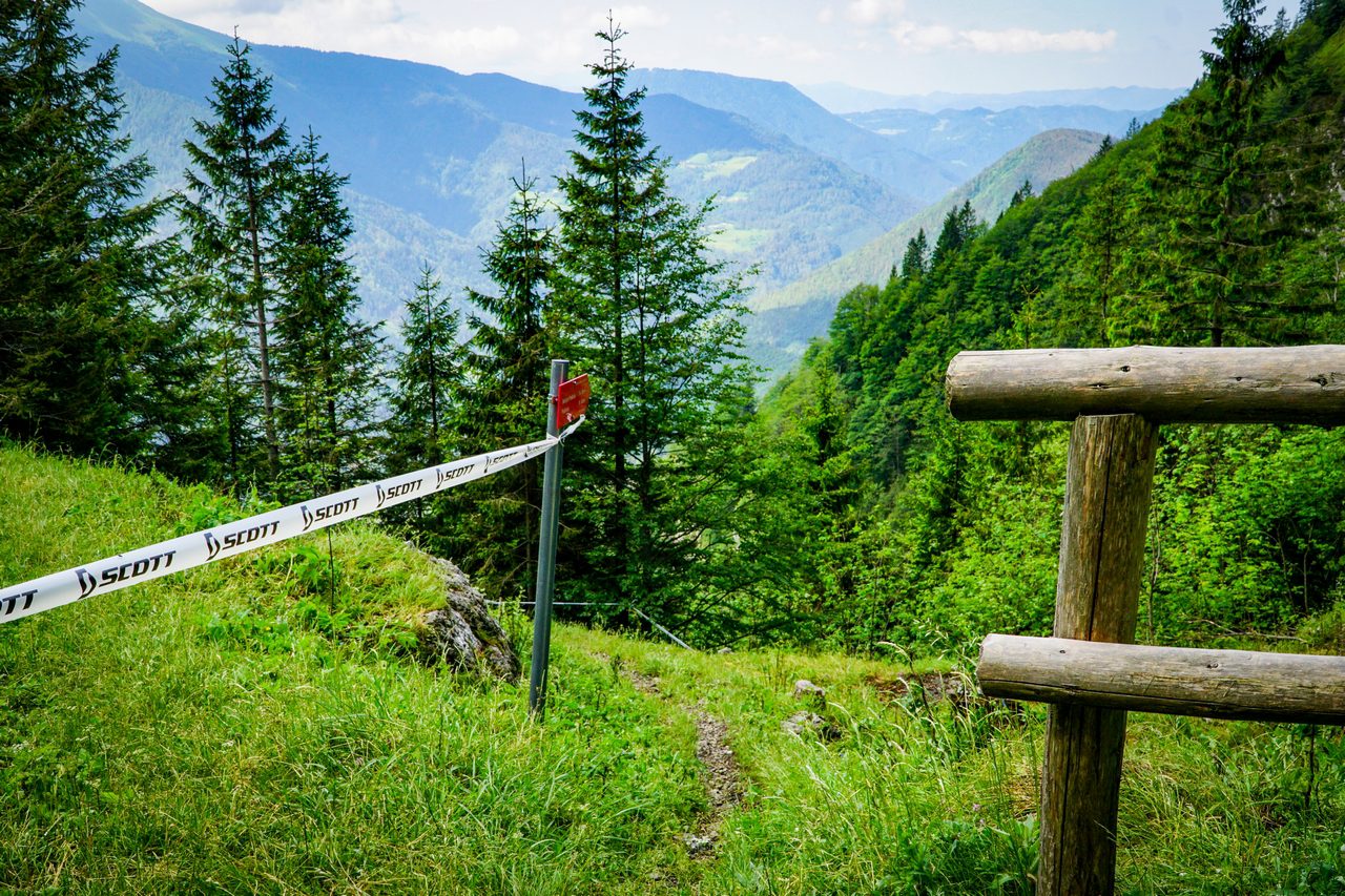My natomiast skupiamy się na przygotowaniu tras. W poniedziałek – pierwszego dnia “pomocy technicznej” odwiedziliśmy Most na Soči, dojeżdżając na miejsce z Bohinja wspomnianą już wyżej kolejką. W praktyce wyglądało to tak: podjeżdża sobie lokomotywa z płaskimi naczepami, na które wjeżdża się samochodem i czujemy się podobnie, jak na promie. Przejazd przez górę tunelem wykopanym po I Wojnie Światowej zajmuje około 30 minut, podczas gdy podróż samochodem przez góry mniej więcej 3 razy tyle. Czasami w tunelu podnosi się poziom wody i z powodu podtopienia kursowanie kolejki nie jest możliwe, a przepustowość tego rozwiązania też nie poraża skutecznością, niemniej jest to całkiem przyjemne przeżycie i z pewnością gwarantuje Wam trasę widokową w przerwach pomiędzy kolejnymi odcinkami tunelu. Natomiast po dotarciu na szczyt, otoczeni pięknymi Alpami julijskimi, zabraliśmy się do roboty. Polegało to na odświeżeniu istniejącej już trasy, wykoszeniu trawy, zgrabieniu luźnych kamieni, zgrabieniu zalegającej po zimie zieleniny i oczywiście – otaśmowaniu. W kilku miejscach poprawienia wymagały bandy, z własnej inicjatywy poprawiliśmy również malutkie dropiki i ich lądowania. Zjazd ze startu zajmie zawodnikom około 10 minut, nam natomiast schodzenie z ogarnianiem zajęło niemal cały dzień. Trasa w Moście na Soči jest przyjemnym i gładkim singlem z kilkoma sekcjami korzeni, małymi dropikami i atmosferą znaną z lasów Jury Krakowsko-Częstochowskiej (w skali makro ;) ).