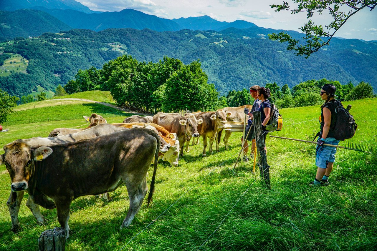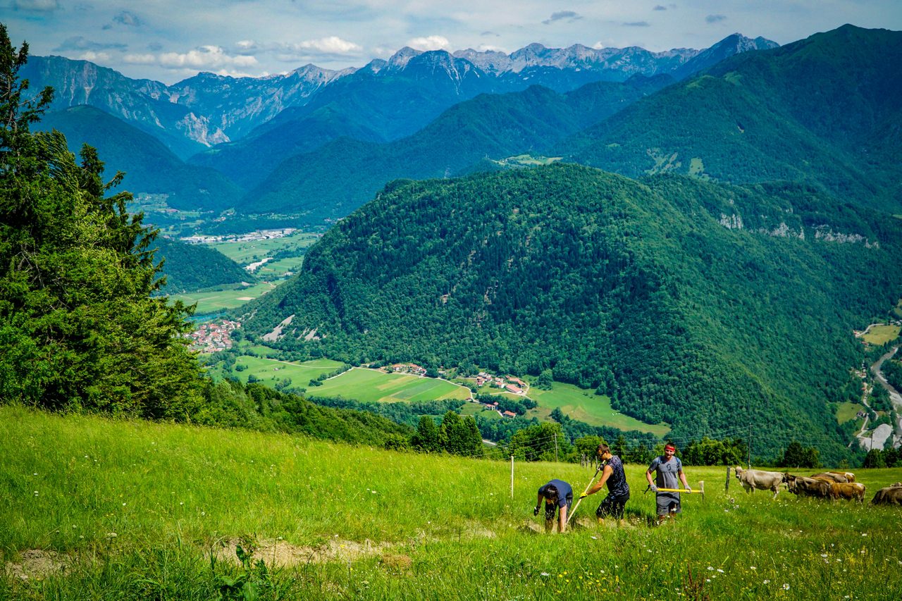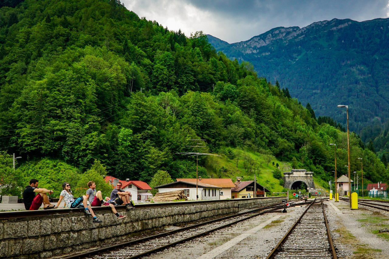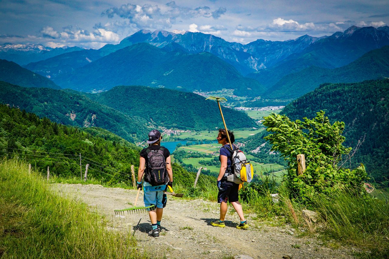 My natomiast skupiamy się na przygotowaniu tras. W poniedziałek – pierwszego dnia “pomocy technicznej” odwiedziliśmy Most na Soči, dojeżdżając na miejsce z Bohinja wspomnianą już wyżej kolejką. W praktyce wyglądało to tak: podjeżdża sobie lokomotywa z płaskimi naczepami, na które wjeżdża się samochodem i czujemy się podobnie, jak na promie. Przejazd przez górę tunelem wykopanym po I Wojnie Światowej zajmuje około 30 minut, podczas gdy podróż samochodem przez góry mniej więcej 3 razy tyle. Czasami w tunelu podnosi się poziom wody i z powodu podtopienia kursowanie kolejki nie jest możliwe, a przepustowość tego rozwiązania też nie poraża skutecznością, niemniej jest to całkiem przyjemne przeżycie i z pewnością gwarantuje Wam trasę widokową w przerwach pomiędzy kolejnymi odcinkami tunelu. Natomiast po dotarciu na szczyt, otoczeni pięknymi Alpami julijskimi, zabraliśmy się do roboty. Polegało to na odświeżeniu istniejącej już trasy, wykoszeniu trawy, zgrabieniu luźnych kamieni, zgrabieniu zalegającej po zimie zieleniny i oczywiście – otaśmowaniu. W kilku miejscach poprawienia wymagały bandy, z własnej inicjatywy poprawiliśmy również malutkie dropiki i ich lądowania. Zjazd ze startu zajmie zawodnikom około 10 minut, nam natomiast schodzenie z ogarnianiem zajęło niemal cały dzień. Trasa w Moście na Soči jest przyjemnym i gładkim singlem z kilkoma sekcjami korzeni, małymi dropikami i atmosferą znaną z lasów Jury Krakowsko-Częstochowskiej (w skali makro ;) ).