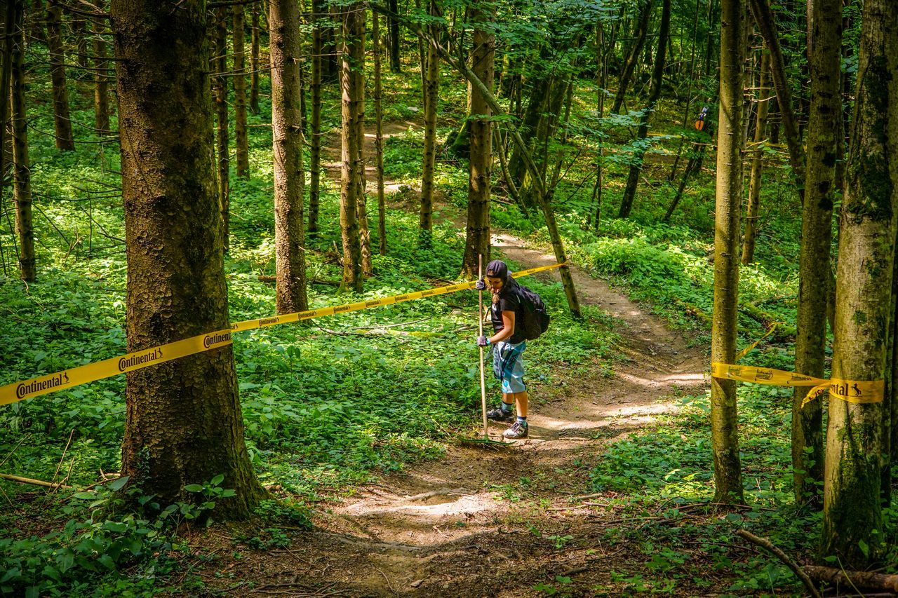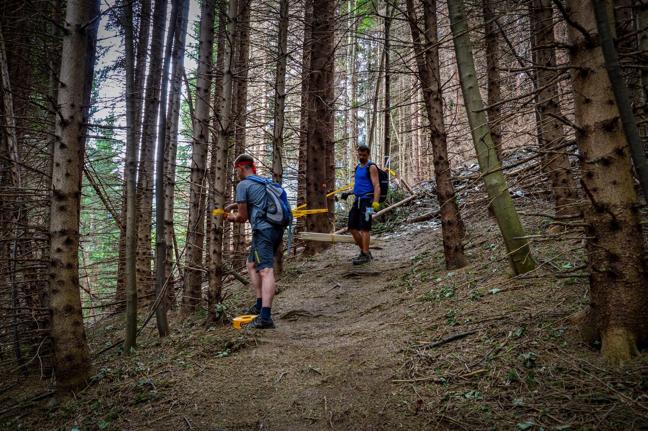 Naszym zadaniem jest taśmowanie tras, poprawianie zakrętów czy… grabienie lasu. Tak, to nie żart – w zasadzie wszystkie porządne europejskie bikeparki wygrabiają liście z tras, żebyście sobie czasami nie wybili zębów podczas zjazdu.