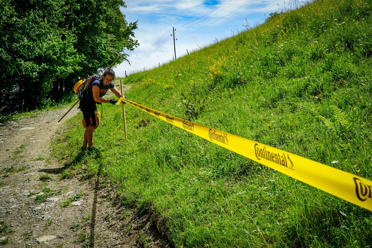 Trzeciego dnia przygotowań wybraliśmy się do lasu widzianego z okna naszego pensjonatu, czyli w Bohinjskiej Bistricy. Z racji obecności pobliskiego jeziora, w godzinach porannych znad lasu unosi się mgła i musi minąć dobra chwila zanim wszystko wyschnie. Niezrażeni rosą na liściach i trawie, ruszyliśmy do boju wyposażeni w kosiarkę, dmuchawę do liści, grabełki i siekierkę. Na miejscu okazało się, że zawodników czeka odmienny od pozostałych charakter tras i będą musieli zmierzyć się z zasysającą gliną, korzeniami jakich nie powstydziłby się nasz rodzimy puchar DH i kamieniami. Uporządkowaliśmy, co się dało, pozostawiając drugiej ekipie ogarnianie tras w Cerknie, które zobaczymy po raz pierwszy w dniu zawodów.