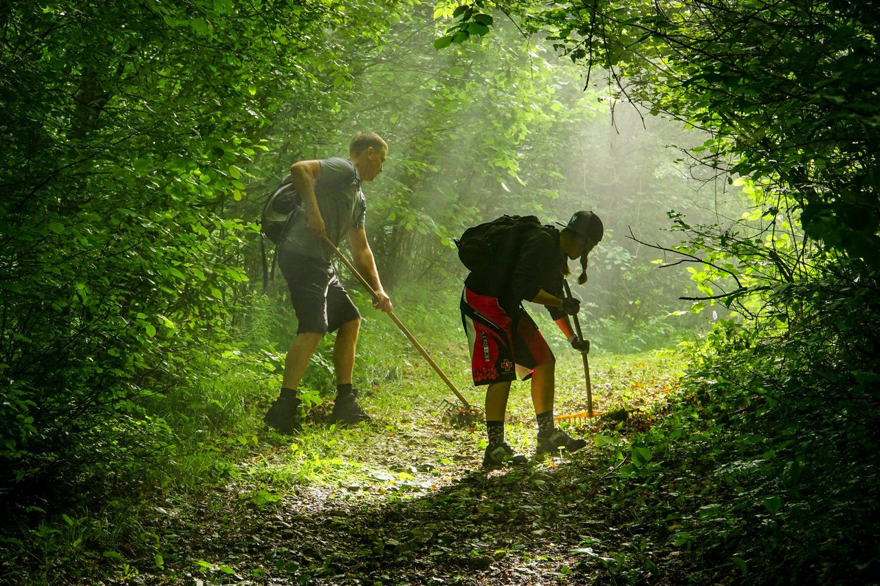 We wtorek wylądowaliśmy w bliżej nieokreślonym lesie, nad miejscowością Podbrdo. Na szczycie znajduje się stara droga militarna z okresu II Wojny Światowej i wszędobylskie bunkry. Widoki – nie do opisania, sami zobaczcie! Inny jest charakter trasy – zdecydowanie bardziej stromy, z milionem dużych i mniejszych kamieni oraz śliskimi korzeniami. Na płaskich odcinkach zalegają mokre bukowe liście, których nie da się przegrabić. Co ciekawe, pod mokrymi liśćmi znaleźliśmy kulki gradu, które pomimo upałów, utrzymały się w ściółce ponad tydzień i wcale nie chciały topnieć.. Także dzień numer 2 upłynął nam pod znakiem grabi (nazwanej w naszej polsko-słoweńskiej mowie grabełkami) i dmuchawy do liści.
