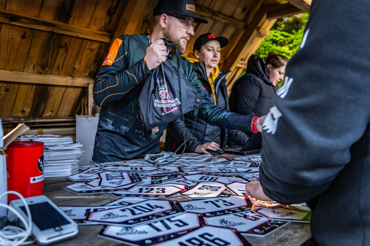 Ścigać się zdecydowanie było z kim, bo miejsca podczas zapisów rozchodziły się szybciej niż świeże bułki. W Góry Świętokrzyskie zjechali nie tylko okoliczni zawodnicy z województwa i nieodległej Warszawy, ale przybyła też spora ekipa z Bielska i innych bardziej górzystych regionów naszego kraju. Ostatecznie w Jeleniowskim Enduro MTB 2024 wzięło udział prawie 200 osób! Pomiędzy amatorami i zaawansowanymi zawodnikami pojawiłem się ja, z misją mojego pierwszego startu w zawodach enduro. Pomimo, że mam doświadczenie z dawnych lat ze startów W Pucharze Polski DH, 4x, Superligach itp, nie miałem okazji jeszcze ścigać się w klasycznym formacie enduro. Fakt, miałem za sobą etapową czterodniową enduro przygodę Trans Julius w Słowenii, ale jednodniowe zmierzenie się z 5 OS’ami to była dla mnie nowość. Zaplanowana przez organizatorów trasa to 18 km jazdy i prawie 850 metrów przewyższenia. Żeby mieć większy zapas czasu na objazd tras i regenerację pomiędzy przejazdami mierzonymi zdecydowałem się na start w kategorii E-Bike. Był to również mój pierwszy jakikolwiek start w kategorii „ze wspomagaczem”. Od samego początku nastawiałem się raczej na dobry fun i fajną jazdę, niż na urywanie ułamków sekund. Dlatego też nie martwiłem się zbytnio tym, że jadę na nieswoim sprzęcie, który zdecydowanie nie był rasową wyścigówką. Jeleniowskie Enduro od samego początku wydały mi się idealną opcją na „pierwszy start” i jeśli ktoś szuka opcji żeby spróbować to szczerze polecam. Jak było?