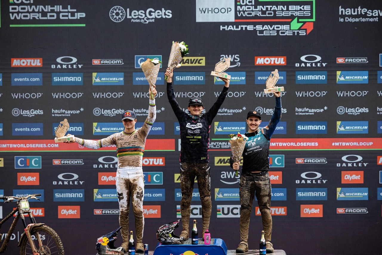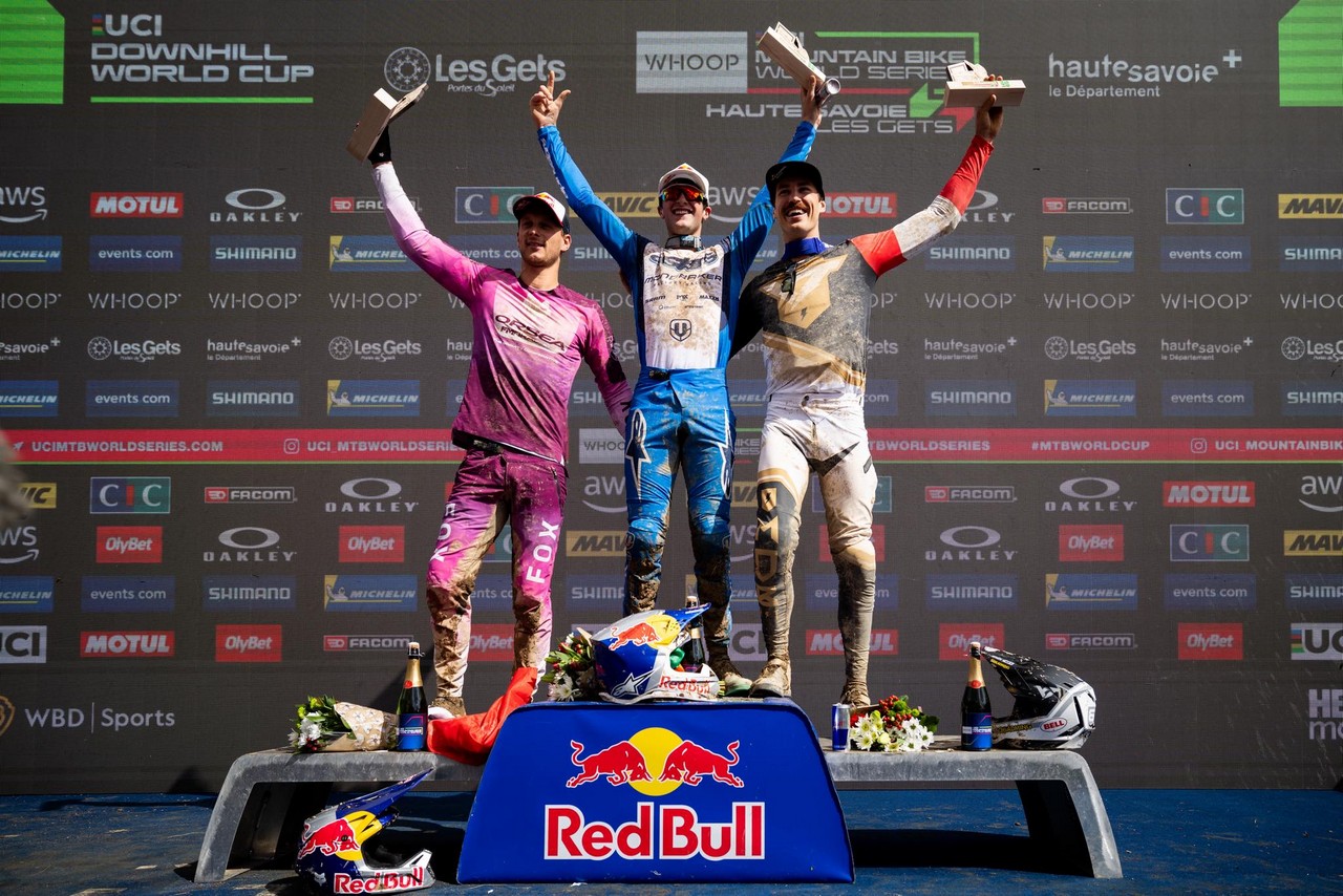 Podium siódmej rundy Pucharu Świata DH 2025 w Les Gets: