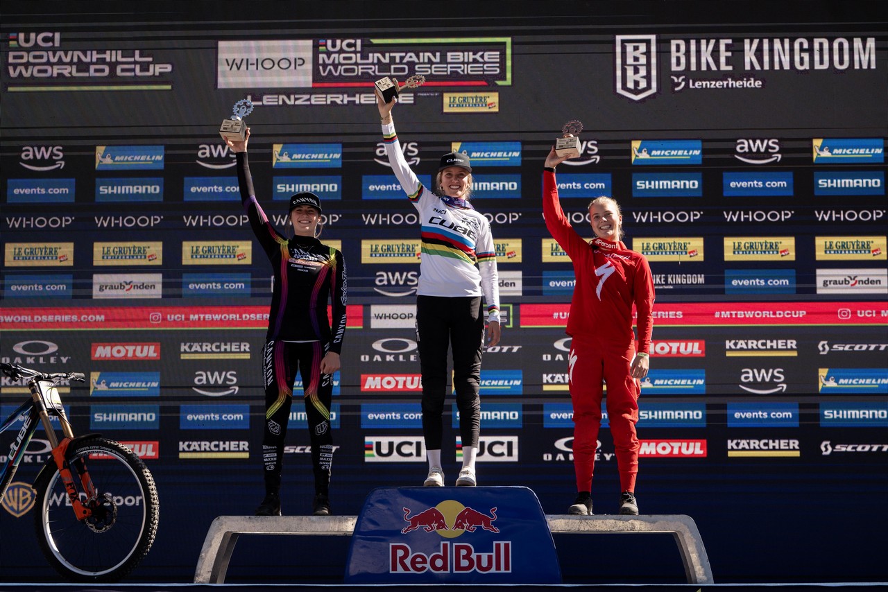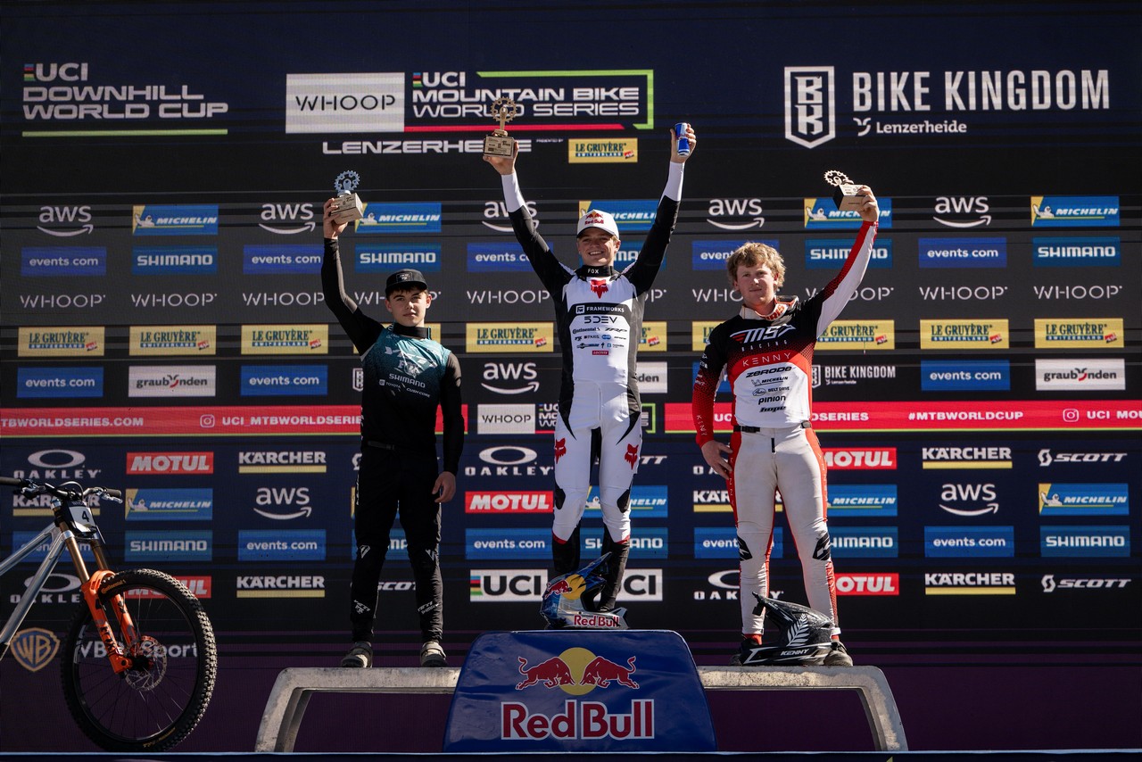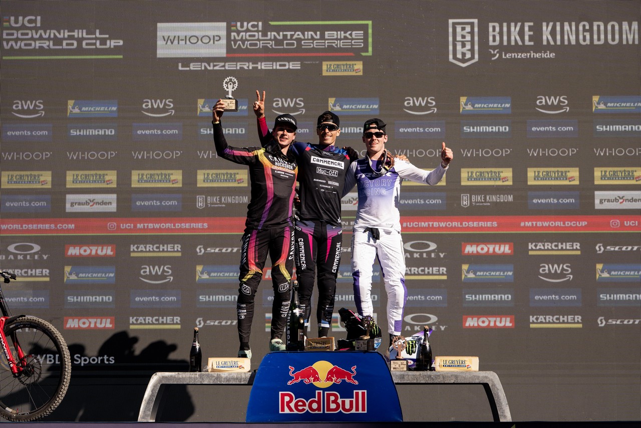 Podium ósmej rundy Pucharu Świata DH 2025 w Lenzerheide: