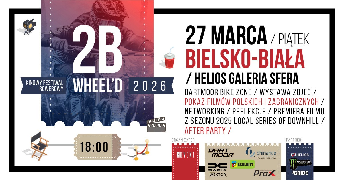 TO JUŻ W TYM MIESIĄCU! Widzimy się po raz pierwszy w większym gronie w tym sezonie, gdzie już w piątek 27 marca 2026 roku w kinie Helios (zlokalizowanym w Galerii Sfera) w Bielsku-Białej startujemy z kolejną edycją kinowego festiwalu rowerowego 2B WHEEL’D.