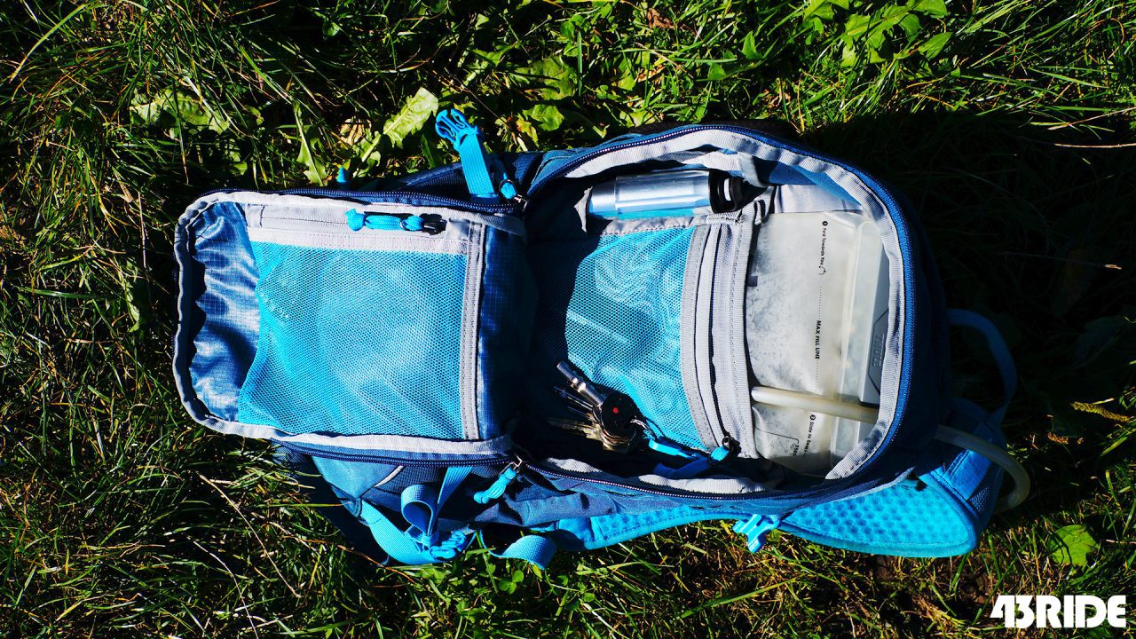 Plecak UpTake 12L ma (zaskoczenie ;) ) 12 litrów pojemności oraz bukłak o pojemności 2,5 litra. Główna komora jest bardzo pojemna, a dzięki głęboko rozsuwanym zamkom można szybko dostać się nawet do dna plecaka. Dodatkowo wewnątrz znajdziemy dwie małe kieszonki na zamek (jedną w plecaku, a drugą od wewnętrznej strony „klapy”), uchwyt na klucze oraz pompkę i oczywiście kieszeń na bukłak.