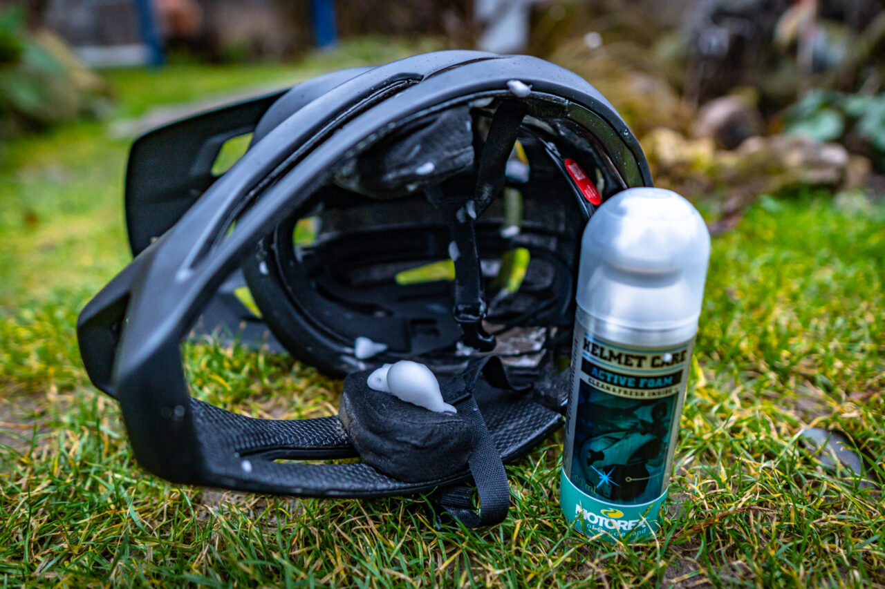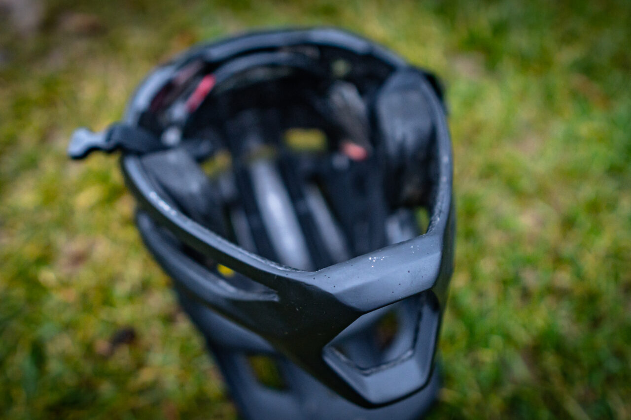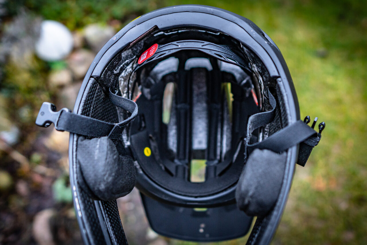 Warstwa gąbek na większości powierzchni jest bardzo cienka , ale dalej ja czuje się w nim komfortowo. Zdecydowanie nie ma tu standardowego uczucia gdzie głowa otoczona jest wszędzie miękkimi gąbkami. Pierwsze wrażenie nie jest więc tak komfortowe jak w klasycznych pełnych kaskach. Jednak ma to też swoje plusy. Jeśli nawet się spocimy, to ta minimalistyczna wyściółka bardzo szybko wysycha i nie śmierdzi. Takie rozwiązanie zdecydowanie poprawia też wentylację kasku, która jak na kask typu full face jest na prawdę imponująca. Na krótkich podjazdach, czy podejściach nie ma sensu go zdejmować. Kolejna zaleta to fakt że kask nie wytłumia tak otaczających dźwięków i po jego założeniu nie odcina nas od bodźców ze świata zewnętrznego. Z racji bezpośredniego zintegrowania głównej warstwy gąbek z mocowaniami systemu MIPS SL nie podjąłem się jej wyciągania. Ale gdy potrzebujemy odświeżyć kask wewnątrz to z pomocą przychodzą produkty piorące takie jak aktywna piana Motorex Helmet Care. Jedyne grubsze, klasyczne gąbki to te na wysokości policzków, ale akurat je można jednym ruchem wypiąć z kasku i szybko przeprać.