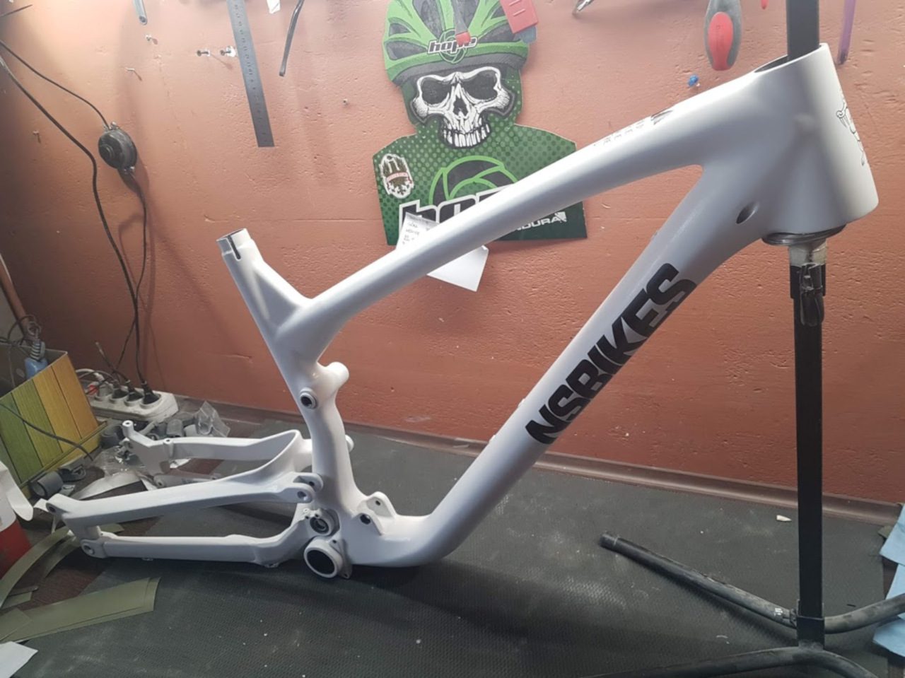 - napis NS Bikes na dolnej rurze – tu mieliśmy dylemat jak ma być umieszczony, ale z racji montażu fabrycznej osłony w dolnej części rury, zdecydowaliśmy się umieścić napisy po dwóch stronach ramy
