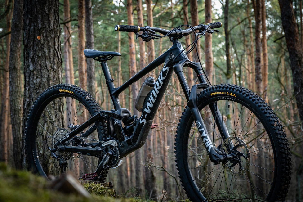 Specialized Enduro w wersji S-Works, zwany przeze mnie Specełem. Poskładałem go pod koniec sezonu 2021 na zawieszeniu Rock Shoxa, kołach Dandy Horse Barion GT Enduro, oraz sprawdzonych w bojach komponentach z serii Shimano XT. Rower ten zdecydowanie najbardziej lubi ostre haratanie w górach, chociaż dzięki stosunkowo krótkiej wersji ramy (rozmiar S3), przyjemnie sprawuje się również na hopeczkach i ciasnych technicznych elementach. Główne zmiany na sezon 2022 to sztyca regulowana One-Up o skoku 180 mm, obsługiwana manetką Shimano mocowaną w systemie I-spec EV. Poza tym damper przy okazji serwisu doczekał się zmodyfikowanej komory MegNeg. Do tego wjechały świeże opony Continental z nowej serii Kryptotal i śmiało mogę ruszać w konkretny teren!