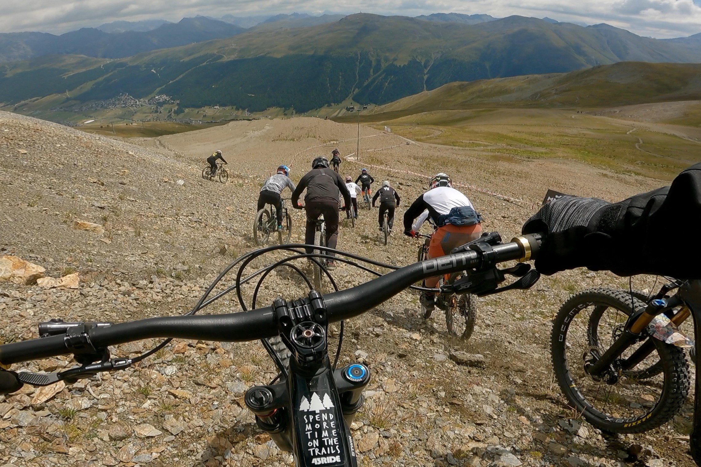 Trzeciego dnia festiwalu Great Days można było wybrać wycieczkę po okolicy na elektrykach prowadzoną przez Hansa Reya. Drugą opcją, na którą nasza ekipa się zdecydowała, był wyścig w formie Avalanche. Wyjątkowość tej formy zjazdu polega na wspólnym starcie wszystkich chętnych. Zanim jednak przystąpiliśmy do głównego wyścigu to czekały nas eliminacje. Konkretniej były to wyścigi losowo wybranymi piątkami zawodników trasą Blueberry. Nie ma tu żadnego pomiaru czasu, po prostu zawodnicy startują w jednym momencie i wygrywa ten kto pierwszy przekroczy linię mety przy dolnej stacji gondoli. Mój osobisty kiepski start zaowocował tym, że na krętej trasie musiałem wyprzedzić 3 zawodników, ale pomimo dość zaciętej (ale bezpiecznej) walki udało mi się ukończyć kwalifikacje na pierwszym miejscu. Do głównego biegu finałowego przechodzili wszyscy chętni, a ten pierwszy miał za zadanie tylko wyznaczyć kolejność układania rowerów na miejscu wspólnego startu. Główny start został ustawiony niedaleko górnej stacji wyciągu. Krótki szeroki fragment poprowadzony na dziko wpadał prosto na trasę Bikers United, która potem przechodziła płynnie w Blueberry. Taki wariant oferował prawie 1000 metrów przewyższenia i kilkanaście minut konkretnego zjazdu.