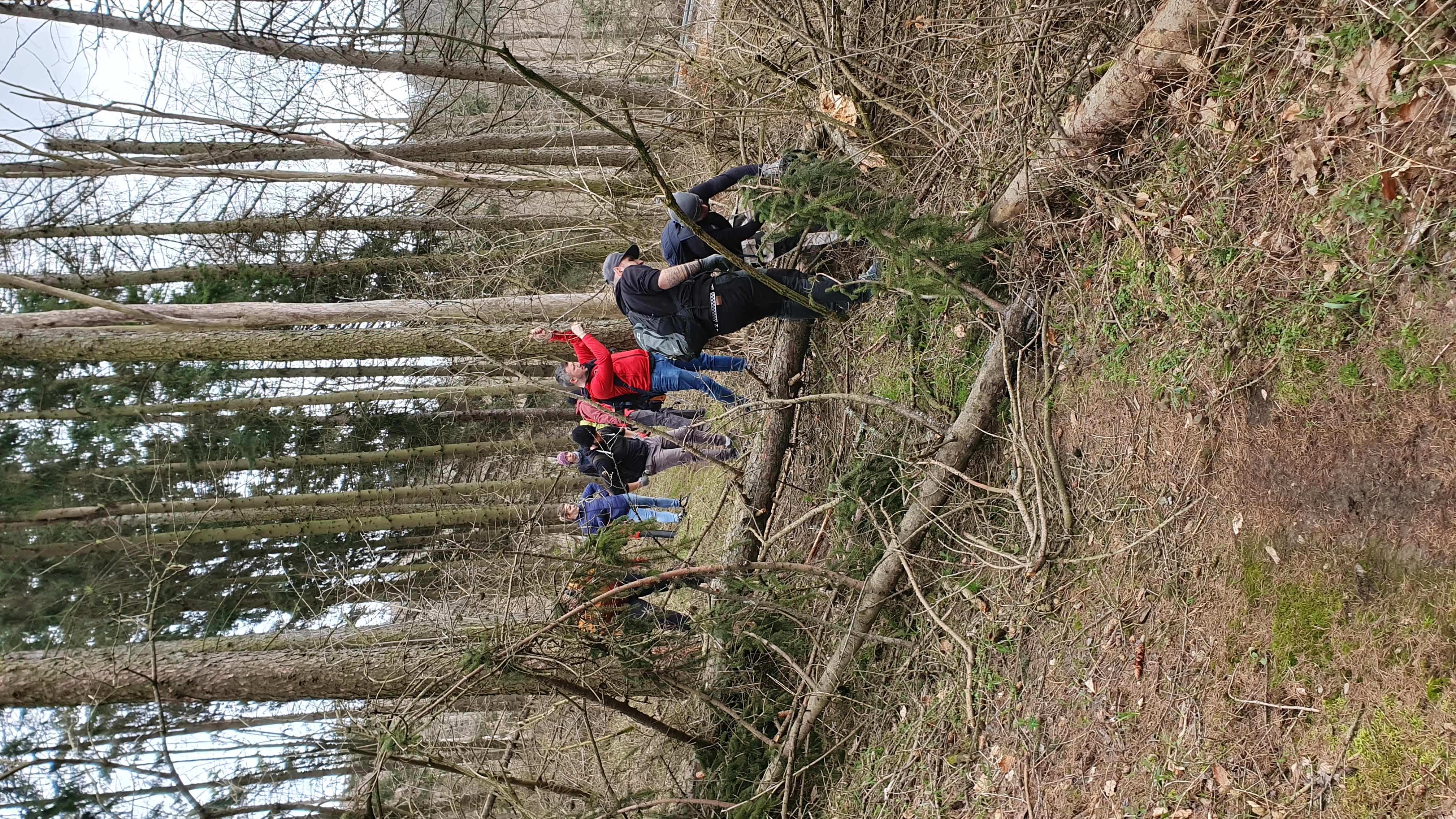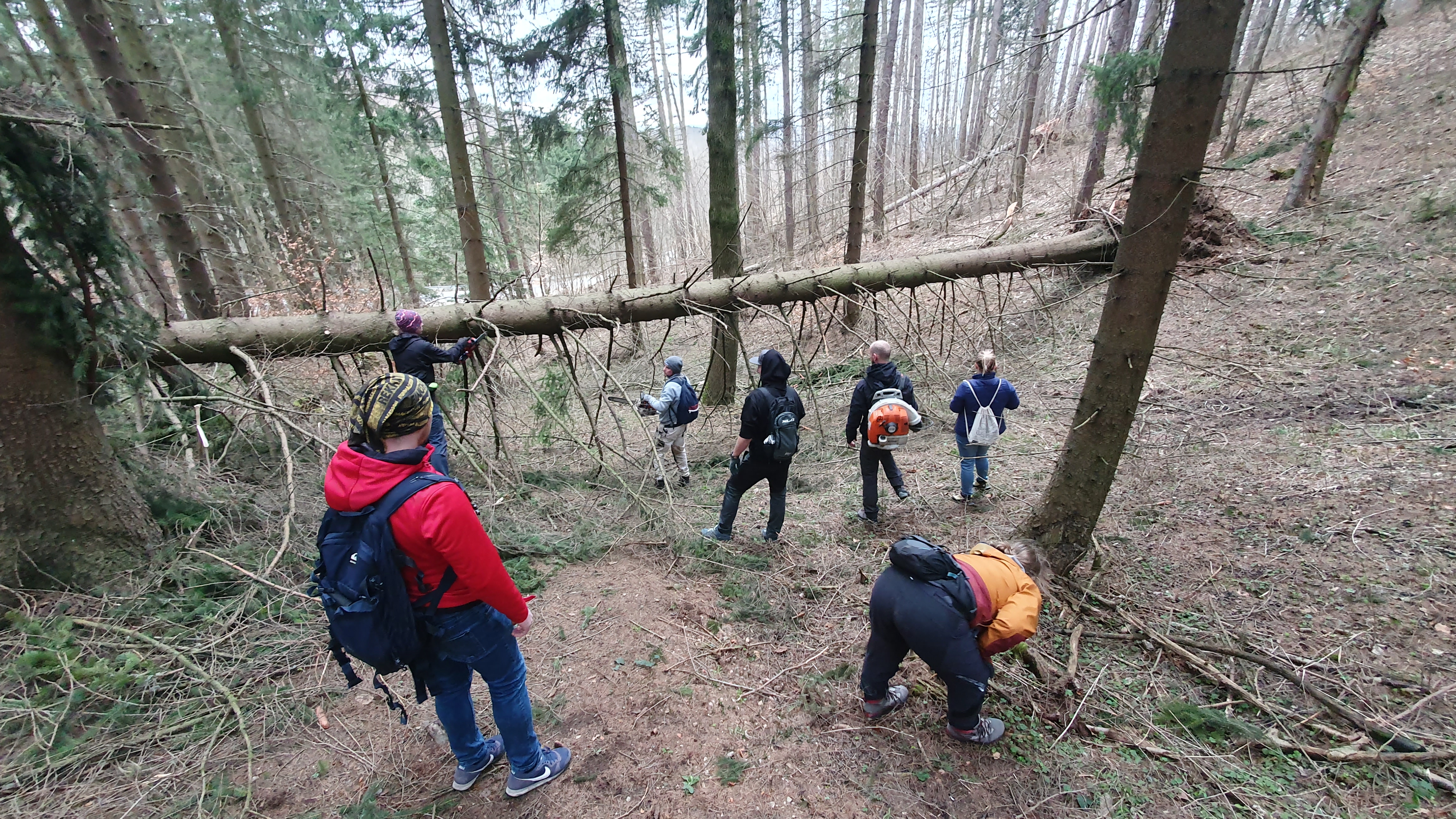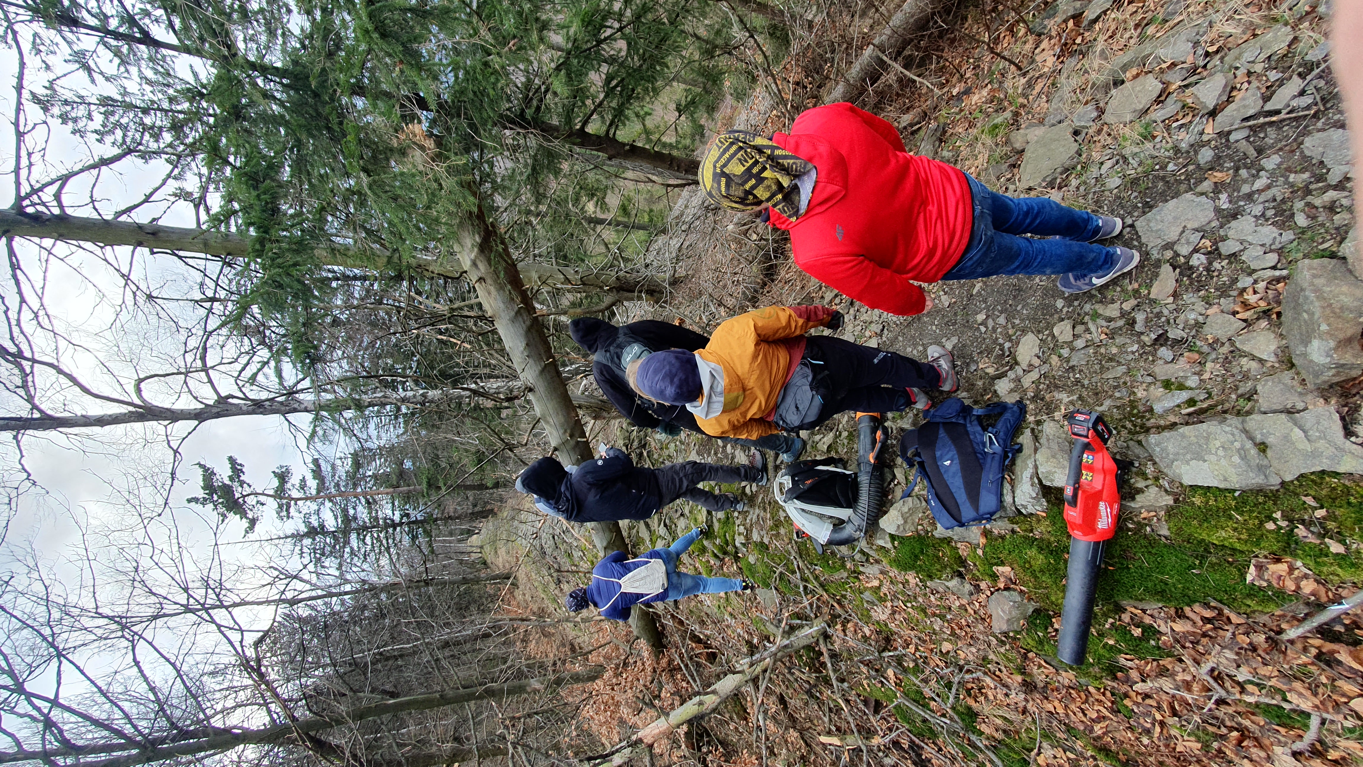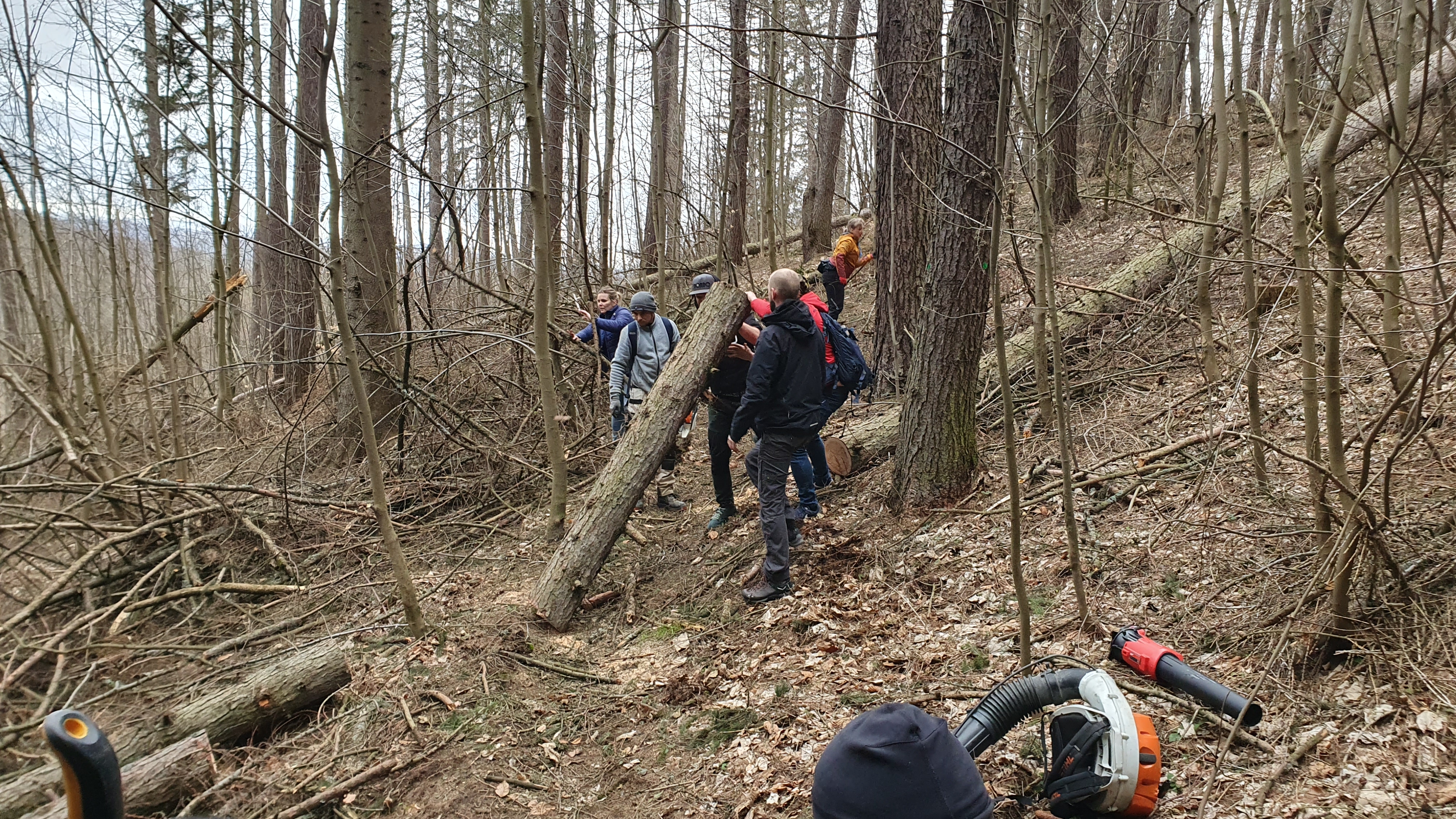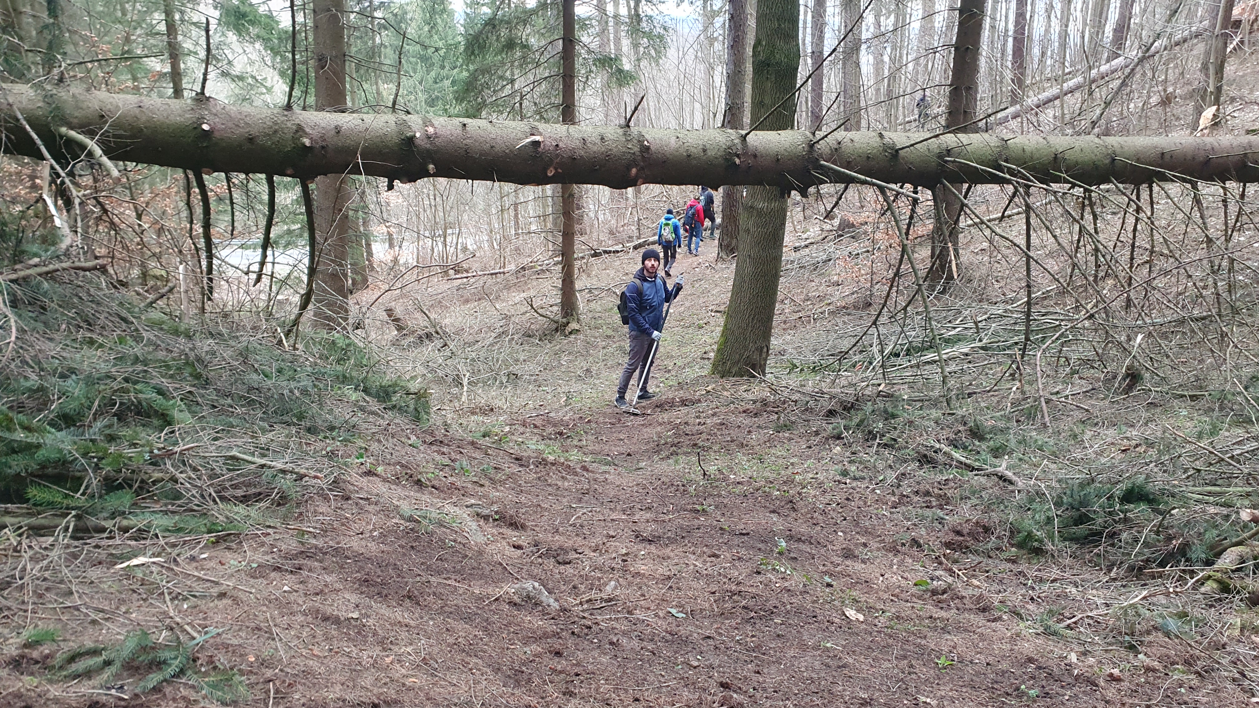 Pracy jest dużo, ponieważ natura tej zimy dość mocno dała znać o swojej potędze. Po przejściu tzw. okiści głównym problemem jest masa zwalonych drzew i gałęzi. Praca polegała głównie na wycięciu tych blokujących przejazd, ogarnięciu gałęzi i przegrabieniu luźnych elementów. Każdy zespół miał jednego profesjonalnego pilarza, więc nam zostało głównie odgarnięcie ścieżki. Większość głównych tras została oczyszczona już wcześniej, więc teraz uwaga skupiła się na łącznikach i dodatkowych OS’ach, które są integralną częścią kompleksu tras enduro Srebrna Góra. Ja z wesołą ekipą zająłem się OS’em Chochoł Wielki. Oczyszczenie całości i wytyczenie jednego nowego objazdu szło nam sprawnie i po ok 3,5 godzinie byliśmy z powrotem na dole. Krótka przerwa renegeracyjna, a po niej ruszyły pierwsze tarpany.