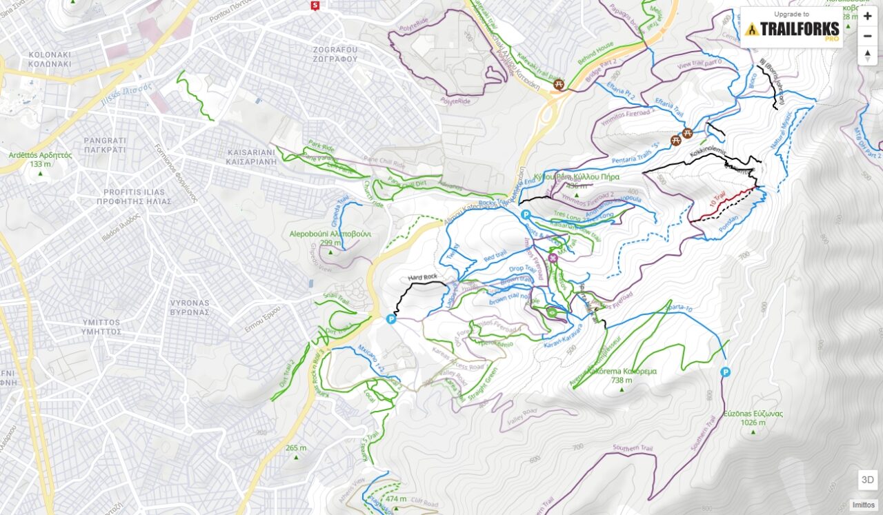 W sumie w Atenach miałem spędzić ponad miesiąc. Przed wyjazdem zrobiłem oczywiście drobny research, chociażby pod kątem gdzie najlepiej wynająć mieszkanie, żeby było w miarę blisko na jakieś trasy. Po przejrzeniu Trailforska wybór szybko padł na okolicę pasma Imittos, które otacza miasto od wschodu. Najwyższy szczyt pasma wznosi się na ponad 1000 metrów, a jego zbocza opadają do poziomu morza, więc przewyższenia nie brakuje. Wg Trailforksa znajduje się tam sporo tras, porozrzucanych w różnych częściach pasma. Dogrzebałem się też do kilku klipów nagrywanych tam przez Philla Atwilla (Brytyjski zawodnik Pucharu Świata DH, który poza sezonem mieszka w Grecji) i całość wydawała się bardzo obiecująca. Ostatecznie znaleźliśmy więc mieszkanie w dzielnicy Liupoli, tuż obok pasma Imittos, przy metrze i w niedalekiej odległości od centrum Aten. Wiadomo oczywiście że patrzenie na mapie swoje, a rzeczywistość wygląda nieco inaczej. Na miejscu okazało się że Ateny są przeogromne i odległości, które na mapie wydawały się niewielkie, w rzeczywistości wcale nie były małe. Dodatkowo samo miasto wcale nie jest płaskie i niektóre ulice są tak strome, że można było zapomnieć o podjeżdżaniu na rowerze bez wspomagania. Ostatecznie okazało się jednak że mieszkanie wybraliśmy idealnie, chociaż na same trasy zazwyczaj jednak dojeżdżałem samochodem.