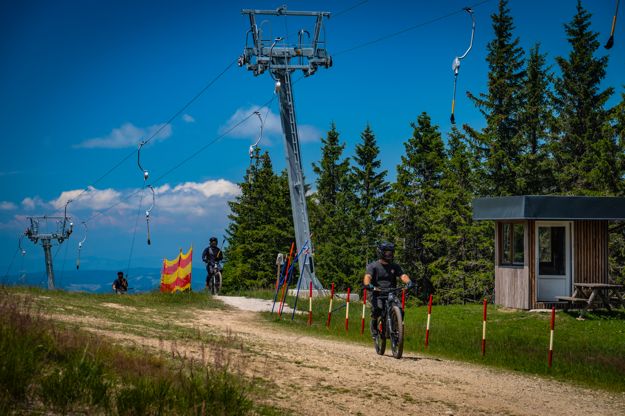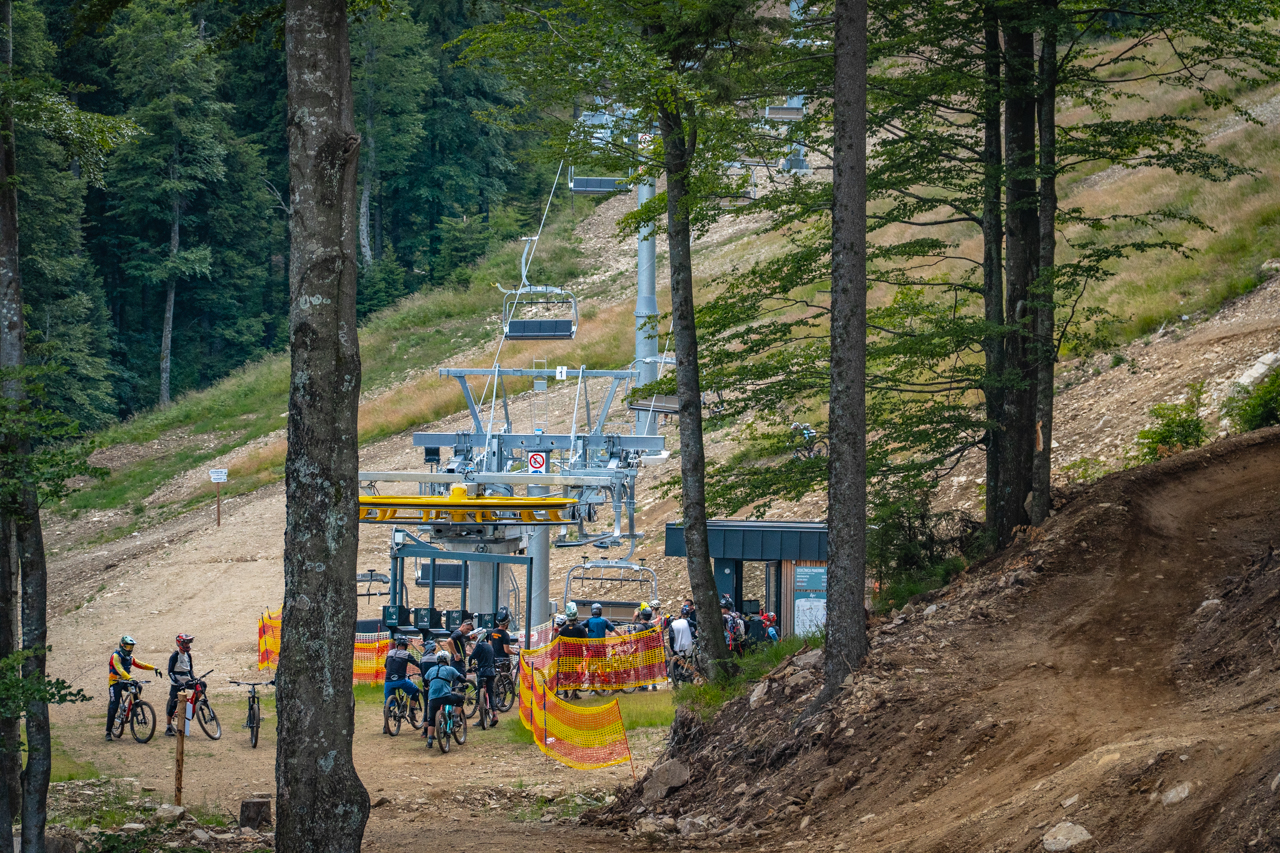 Jak już wyżej wspominałem do dyspozycji rowerzystów jest tu 5 wyciągów. Każdy z nich obsługuje inną strefę z trasami. Krótkie pojazdy na strefy Sedlo i Velika Kopa obsługują wyciągi talerzykowe wyposażone w bardzo dobry i prosty w obsłudze system Easy Loop (taki sam jak np. w Wexl Trails). Niestety wyciągi krzesełkowe to proste konstrukcje nie-wyprzęgane oraz posiadające bardzo klasyczne haki na rowery. W efekcie pomimo że nie pokonujemy bardzo dużego dystansu czy przewyższenia, wjazd z rowerem zajmuje sporo czasu. Człowiek szybko się przyzwyczaja do dobrego i ja akurat przed wizytą w Kope byłem kilka dni w Schladming, Leogang i Saalbach, gdzie w tym samym czasie wyciąg pokonuje z 2 albo 3 razy więcej dystansu i przewyższenia, więc pierwszego dnia mnie to trochę męczyło. Jeśli chcemy cały dzień „lapsować” różne trasy w Kope to musimy liczyć się z tym, że spędzimy sporo czasu na wyciągu, no ale warto. Różne strefy powodują że rowerzyści rozjeżdżają się po dużym terenie i nawet podczas trwania festiwalu Flat Out Days, raczej nie było problemu z kolejkami. Jedne z najbardziej obleganych tras: Horseshoe i Holy Grail, są dostępne z dwóch różnych wyciągów, więc zawsze można było wybrać ten z mniejszą ilością oczekujących.